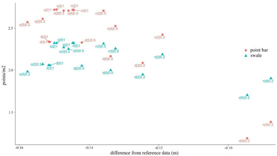 We revealed that the greatest accuracy (i.e., the smaller differences between the reference and measured values) was found in the ground point classifications of smaller points densities: 1.38 points/m2 for point bars and 1.90 points/m2 for swales (Figure 10). Furthermore, the best CSF parameters were in accordance with the previous results, and the fewest points, the cloth size of 5, and the threshold of 0.2 resulted in the highest accuracy. The noise reduction was efficient, and, although the difference between them was slight (less than 0.01 m), the neighborhood-related filtering was the most effective. Resolution had a significant effect on the accuracy, but the difference was only 0.009–0.011 m between the 1 and 2 m geometric resolution models. Generally, the accuracy of the swales was always below that of the point bars by 0.057–0.069 m.