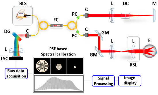System configuration of the SD-OCT system. Abbreviations: BLS, broadband laser source; C, collimator; DG, diffraction grating; DC, dispersion compensator; E, eye; FC, fiber coupler; GM, Galvano mirror; L, lens; LSC, line scan camera; M, mirror; PC, polarization controller; RSL, retinal scanning lens.