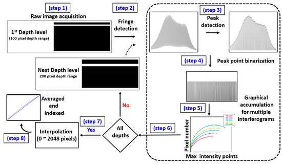 Resampling schemes involving a graphics processing unit (GPU) have been frequently proposed in relevant studies to convert the wavelength domain to the wavenumber domain enhancing the data acquisition speed [20,30]. In SD-OCT, a technique for linearization of spectral fringe signals has been demonstrated by correcting the ν = c/λ relation with both software and optical hardware elements by extracting accumulative phase evolution of the interference fringes [30,31,32,33]. In the aforementioned techniques, the interference fringe patterns were processed using linear interpolation with fast Fourier transformation (FFT), cubic spline interpolation with FFT, non-uniform discrete Fourier transforms (NDFT), and non-uniform fast Fourier transforms (NFFT). Furthermore, compressed sensing methods that are based on wavenumber domain linearizing techniques have been demonstrated to simplify complex numerical methods [18,26]. Some studies have also focused on optical hardware optimizations by using a wavelength-scanning filter technique, which provides lookup tables instead of interpolating non-linear data [34,35]; other studies have used prism implementations to achieve real-time imaging [17,25,36].