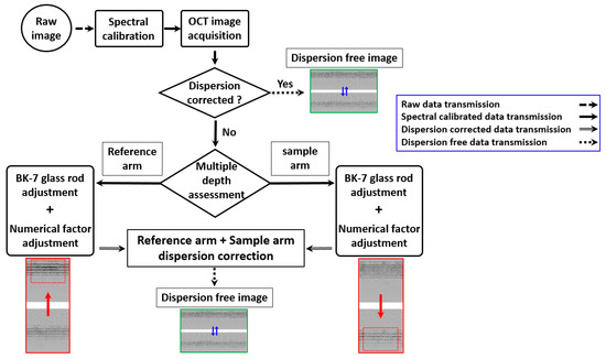 Moreover, cubic-spline interpolation is a complex numerical calibration technique, where the image pixels are stored in a compute unified device architecture (CUDA) array and bound to a designated region in a texture memory. Resampled data points are generated by interpolating the raw fringe data points, which eventually provides evenly distributed pixel information. From the entire array of pixels, raw data were extracted from 0~800 pixel depth range due to weakened fringe information (less intensity) of the extreme corner beyond the 800 pixel range. Therefore, 8 PSF measurements (n = 8) were acquired with a pixel interval of 100 pixels, which provided sufficient raw data of the entire depth range with least missing depth information that eventually led to a precise spectral calibration. Fewer PSF measurements (n < 8) will reduce the preciseness of data with lack of depth information, which has negative impact on distinguishing deep layers of OCT B-scans. Although non-uniform data point distribution was corrected, a slight dispersion was identified on the image due to mismatch between the reference and sample propagating paths, where the light is specularly reflecting from the mirror surface; and secondly, due to depth-dependent dispersion of the sample with several layers of coverslip glass. Thus primarily, the spectral calibration was performed to enhance the depth dependent sensitivity, and secondly the dispersion mismatch was compensated using both hardware (dispersion compensating glass-rods) and numerical operations based software methods. Figure 3 illustrates the flow diagram of the fundamental steps performed after the spectral calibration to further compensate dispersion of the system. To decouple two technical contributions (spectral calibration and dispersion compensation), a single frequency channeled spectrum with no dispersion compensation was acquired in the original state of the image initially. This data stream contains different sampling information between sample and reference arm, which is the main cause for the image dispersion. Next to confirm the exact optical arm with dispersion, BK-7 glass rods (dispersion compensating glass rods) were placed on reference arm. A sample consists of multiple (five) glass cover slips representing multiple depth levels was placed on sample arm and the image was visualized. Raw data of the corresponding image was extracted and arranged to examine dispersion variation. This set of raw data was arranged and inserted to the spectrum calibration algorithm. Instead of using the phase information of the interferogram, fundamental index intensity of the interferogram was varied to compensate dispersion. A numerical multiplication factor with an intensity weight (numerical weight with hundredth decimal point starting from 1) was utilized in the algorithm to match the dispersion of all the corresponding depth levels. The utilization of this numerical multiplication factor results in adjustments of the index weight and sampling of the entire array, which interpolates an index to calibrate the spectrum. The exact numerical factor, which calibrates the spectrum is verified after successful interpolation attempts, and the entire interpolated raw index array is Fourier transformed and log scaled for the image visualization. Simultaneously, the index intensity can be continuously varied to enhance the image quality until the spectrum calibration is satisfactorily accomplished. The performed BK-7 based reference arm dispersion compensation can be successfully confirmed if the acquired image reveals a similar thickness in all depth levels of the sample. When a thickness difference is identified at deeper regions, dispersion of the sample arm has to be corrected using additional BK-7 glass rods until a sufficient dispersion compensation with similar thickness for all depth levels is obtained. Subsequently, a new set of raw data can be arranged and index intensity has to be varied through the numerical factor of the spectrum calibration algorithm to match further dispersion of the entire depth range. The utilization of this numerical factor results in adjustments of the index weight and sampling of the entire array, which simply leads to an index interpolation to compensate dispersion. As a result of this decoupled operation of the spectrum calibration technique and dispersion compensation technique, the dispersion mismatch between reference and sample arms can be compensated by cancelling the frequency-dependent real and the imaginary parts of the spectral fringe pattern, which are used to construct the complex analytical representation of the spectral fringe pattern.