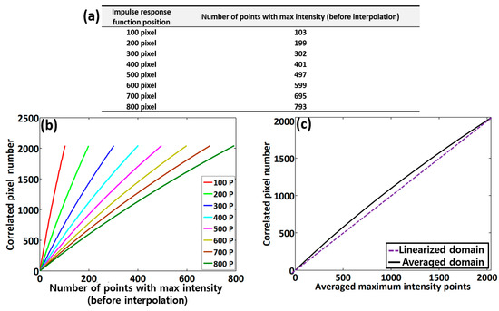 Figure 4b shows the correlated pixel numbers (pixel positions) at each number of points with maximum intensity prior to interpolation acquired during the assessment of each depth-dependent PSF position. The solid black color curve of Figure 4c emphasizes the summated and averaged curve of eight corresponding curves of Figure 4b illustrating pixel position information over each averaged maximum intensity point. From the results, it is seen that the practical point distribution is no longer linear owing to the spectral errors that occur in spectrometer. Therefore, we deliberately generated a calibrated domain, where the non-linear points were re-indexed and linearized. The purple dashed curve shows the deliberately generated linear domain obtained after curve fitting, which is initiated from the lowest averaged maximum intensity point to uppermost point. We used the closest method for a linear pattern by selecting the closest value between the measured averaged intensity point and the linear point, where the index values were later utilized in a real-time image acquisition program.