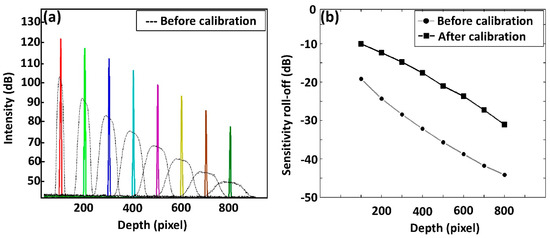 Figure 5a shows the depth dependent intensity fall-off of the system, where we obtained PSFs before and after applying the spectral calibration technique. The black dashed curve shows the intensity roll-off before calibration verifying the broadening effect of the spectral width. The multicolor solid sharp peaks show the intensity roll-off after the spectrum was calibrated. The comparison shown in Figure 5a clearly reveals that the averaged fall-off curve acquired after the spectral calibration exhibits much less decay than the averaged non-calibrated roll-off, across the whole imaging depth range. Similarly, the depth-dependent sensitivity roll-off emphasizing signal-to-noise ratio (SNR) graphs acquired before and after spectral calibration are plotted in Figure 5b. A significant sensitivity roll-off (28 dB) occurs prior to the spectral calibration, while the intensity fall-off was 14 dB after calibration.
