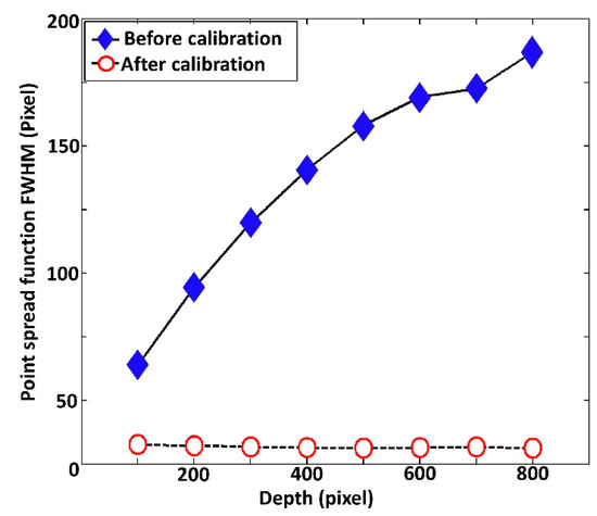 We further examined and compared the FWHM between before and after spectral calibrated depth-dependent PSFs as shown in Figure 6. Our primary objective of this evaluation was to gain a better understanding of the depth visualizing sensitivity and pixel-resolution of deep structures, as the FWHM has a direct impact on the pixel-resolution incorporated axial resolution. Thus, the evaluated FWHM of the peaks are presented as pixel units, which have a direct relationship with thickness. According to the graphical representation, Figure 6 suggests that the trend of the non-calibrated PSF width increasingly fluctuates in the deeper regions, while the width of the spectrally-calibrated PSF remains relatively constant across the whole imaging depth range. Henceforth, this comparative evaluation demonstrates that the developed spectral calibration method effectively improves depth-visualizing sensitivity and resolution in deeper imaging regions for SD-OCT systems. Therefore, examined depth-dependent PSF intensity fluctuation and sensitivity roll-off of our method emphasized a higher sensitivity with less noise residual confirming the potential merits over previously reported conventional techniques [17,26].