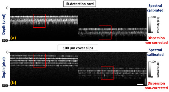 Spectrum calibrated two dimensional OCT images acquired prior to dispersion compensation. (a) 2D-OCT images of the infrared (IR)-detection card at top and bottom depth levels. (b) 2D-OCT images of five glass cover slips at top and bottom depth levels. Red color square boxes represent a region of interest with non-corrected dispersion. Horizontal scale bar: 1 mm, vertical scale bar: 300 μm.