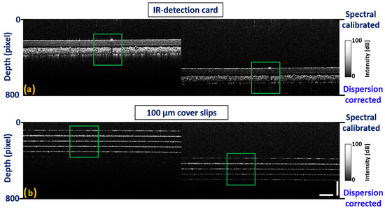 Spectrum calibrated two dimensional OCT images acquired after performing dispersion compensation. (a) 2D-OCT images of IR-detection card at top and bottom depth levels. (b) 2D-OCT images of five glass cover slips at top and bottom depth levels. Green color square boxes represent a region of interest with corrected dispersion. Horizontal scale bar: 1 mm, vertical scale bar: 300 μm.