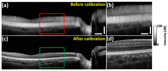 In Figure 9, two image sets, each consists of pair of 2D-OCT images of an exact similar location of the human retina are presented. Figure 9a illustrates the 2D-OCT image acquired prior to the calibration and Figure 9c shows the image acquired after employing the calibration. Figure 9b,d are the zoomed images of the region of interest indicated on Figure 9a,c. Noticeably, the 2D-OCT image shown in Figure 9a emphasizes a less depth-visualizing sensitivity and less resolution in deep structures (in the case where no spectral calibration was performed) compared to Figure 9c, where the qualitative representation was significantly enhanced after calibration. Thus, in terms of SD-OCT based future clinical imaging applications, the developed technique shows good stability and reproducibility for any type of SD-OCT system.