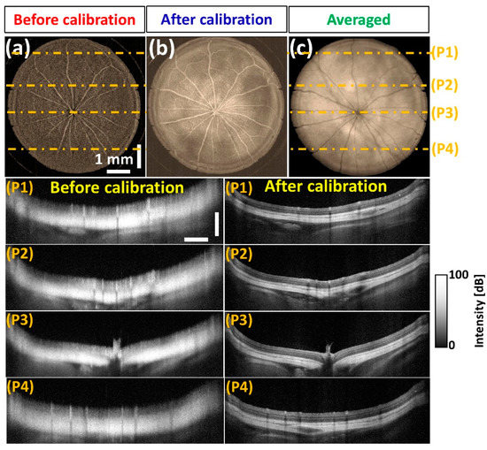 OCT image verification of in vivo rat posterior chamber along with B-scans corresponding to multiple positions. (a) Before calibration, (b) after calibration, (c) averaged posterior vitreous opacifications. The horizontal and vertical scale bars of P1–P4 (position 1–position 4) are 1 mm and 700 μm, respectively.