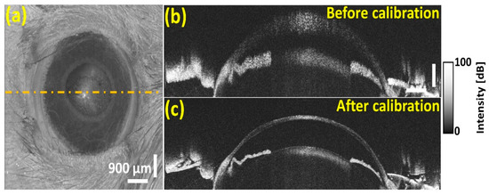 Figure 11a depicts the enhanced 3D-OCT enface visualization of the anterior vitreous opacification, along with B-scans that were obtained before and after performing the spectral calibration technique. In particular, the effective depth visualizing sensitivity enhancement of the anterior segment including cornea, iris, and lens region can be clearly observed after the utilization of our spectral calibration technique. Hence, the results of Section 3.4 qualitatively verified that the developed calibration method performed over the entire spectrum remarkably enhanced the visualization of microstructural features of transparent mediums, such as anterior and posterior vitreous owing to the enhanced depth-visualizing sensitivity and image resolution of deep structures.