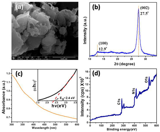 The surface morphology of the as-prepared sample was analyzed using field emission scanning electron microscopy (FESEM), as shown in Figure 1a. The morphology was found to be irregular nanosheets similar to a graphite-like structure. The XRD pattern of Ox-g-C3N4 is shown in Figure 1b. The observed characteristic peaks of Ox-g-C3N4 that appeared at 12.9° and 27.5° correspond to the (100) and (002) plane, with an observed interlayer spacing of 0.685 nm and 0.325 nm, respectively [28,31]. This is in good agreement with the literature values of JCPDS No. (87–1526). The optical properties of samples were carried out by the UV-Vis absorption spectra and the result was shown in Figure 1c. The optical bandgap (Eg) was successfully calculated using tauc’s plot, which is found to be 2.4 eV, as shown in the inset. XPS is a very powerful technique to study the elemental and oxidation states of a sample, as shown in Figure 1d. In the XPS survey scan, peaks were observed at 286.93 eV, 405.7 eV, 530.1 eV; these corresponded to carbon (C1s), nitrogen (N1s), and oxygen (O1s) elements respectively.