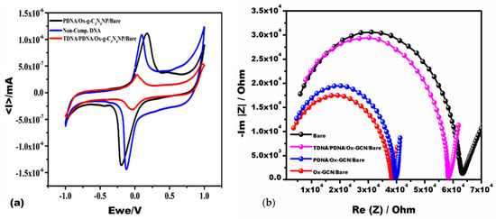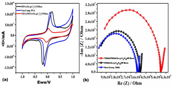 Cyclic voltammetry was conducted to electrochemically study the different stages of the electrode in 0.1 mM KCl containing 1 mM methylene blue. The difference in the peak currents of MB was kept as the basis of the electrochemical study. As can be seen from Figure 2a, a bare ePAD shows a well defined cathodic and anodic peak. This peak is less when compared to Ox-g-C3N4 modified ePAD due to the conductive nature of Ox-g-C3N4. In addition, the redox potential is also shifting towards the slightly higher side, which can also further confirm the immobilization of Ox-g-C3N4. The increase in the anodic current and slight shifting of potential can be due to the fact that the high surface area of Ox-g-C3N4 provided more active sites, which produces a high current. However, there is a slight or insignificant change in potential of about 0.02 V, which can be due to its semi-conductive nature. After the immobilization of PDNA, the peak current decreased, which is due to the non-conductive behavior of PDNA. This (PDNA/Ox-g-C3N4/ePAD) signal peak is greater in comparison to the response of hybridized target DNA (TDNA/Ox- C3N4/ePAD) because the methylene blue (MB) redox indicator gets intercalated between the double-stranded DNA. This can be attributed to the fact that the target DNA (TDNA) successfully hybridized with the capture probe DNA (PDNA). The EIS study is depicted in Figure 2b, which demonstrates the change in resistance charge transfer (Rct) at various stages of electrode fabrication. The bare electrode shows increased Rct as compared to the nanoparticles-modified electrode. After the immobilization of DNA-probe-modified electrode, there was an increase in Rct, but after hybridization with the target DNA, there was a further increase in Rct. The CV results are in line with the EIS results.