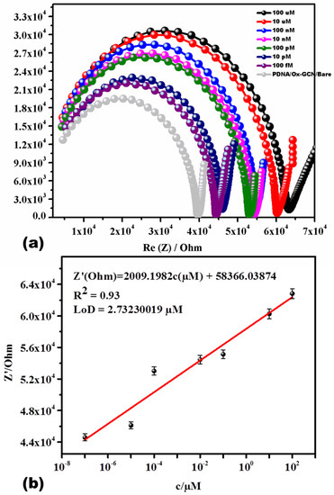 For the hybridization study, different concentrations of complimentary target DNA ranging from 100 fM to 100 μM were chosen and introduced on PDNA/Ox-g-C3N4-coated paper electrodes. As depicted in Figure 3, the current signal of MB decreases with the increase in the concentration of target DNA (TDNA). Methylene blue is a cationic dye containing two amino group which contributed positive charge to the dye and positively charged dye has easily shown electrostatic interaction with the free guanine bases of ssDNA. Once the ssDNA is hybridized with the target DNA, there will be less accessibility of free guanine bases as duplex formation prevents the electrostatic interaction and hence, the signal is reduced [15,16]. This can be attributed to the fact that with an increase in concentration of target DNA, less free guanine base pairs were available for showing interactions with the MB and with decreased concentration more free guanine bases were available for interaction with MB, as a smaller amount of capture probe DNA is hybridized. The response signal in the form of current decreased as there was an increase in the target DNA (TDNA) concentration due to intercalation of MB in between the oligonucleotides of the double-stranded DNA (TDNA) [32]. The EIS results show that with an increase in target concentration, there was more Rct depicted in Figure 3a. Figure 3b shows the calibration plot of the TDNA/PDNA/Ox-g-C3N4/Bare electrode in 0.1 mM KCl containing 1 mM methylene blue.