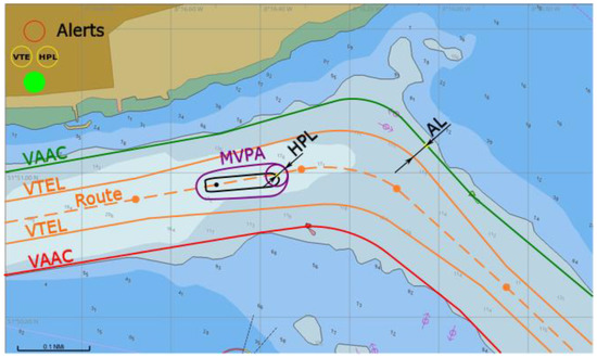 - Protection levels are calculated over time period up to some probability, thus the vessel’s body position (unknown true horizontal position of ship’s hull whose parameters are latitude, longitude and true heading) is located in an area with a certain confidence (integrity risk). This safety region (MVPA) could provide key support information to the navigator or captain to perform safer operations.