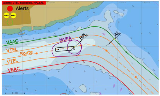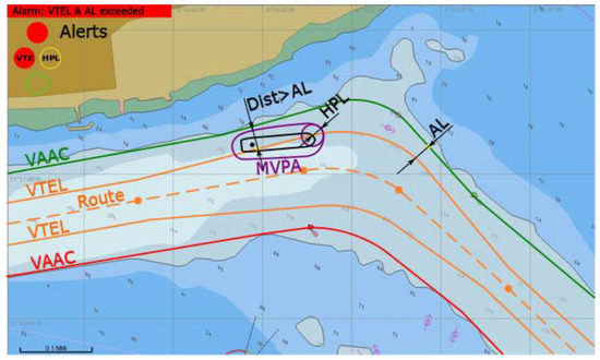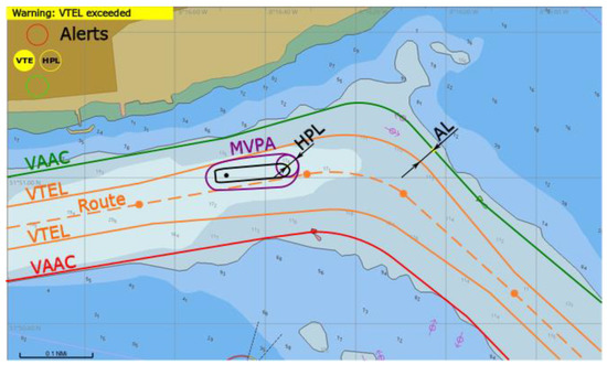 Both VTE (dBk ≤ 0) and HPL alerts are triggered. Further operation (proceeding via fairway based on GNSS) is not permitted (Figure 12). Other means of positioning should be used and then the vessel should steer back to route inside VTEL as soon as practically possible.