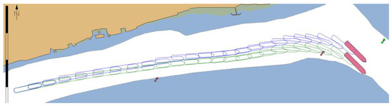 In Figure 15 situation where two passing ships can follow safely their planned routes is presented. In such a case extra distance of dVAAC in the waterway straight segment (designed for passing manoeuvres) is taken into account (calculated according to (41)–(44) of minimum value as advised in [30])).