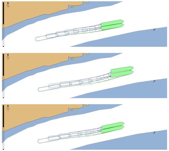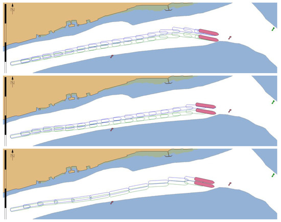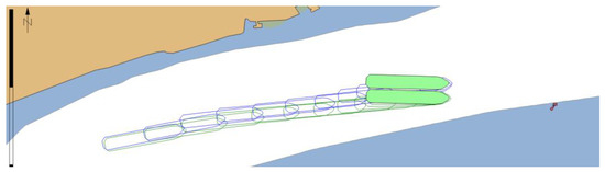Both scenarios tested the performance of MASS remote operator/controller in group of 20 experienced navigators (master mariners and pilots) during evolving GNSS signal degradation that could be expected as a result of propagation problems in restricted water areas or even deliberate spoofing. An increasing error in north direction was simulated. Figure 16 shows the real position of the ship (green outline) and the calculated position that was presented to the navigator (blue outline). Each case resulted in ship’s grounding when system without functionalities of PNT data integrity was used (position marked in red).