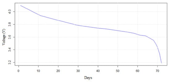 As can be seen in Figure 5, the voltage supplied by the battery starts at 4.1 V and decreases rapidly during the first few days. Meanwhile, as we get closer to the nominal voltage of the battery (3.7 V), the curve decreases more slowly toward this value. Once the voltage drops below the nominal value of the battery, it drops drastically. This behavior is typical of lithium batteries, as is the case here.