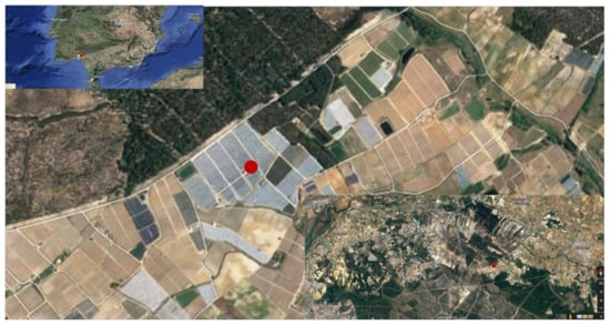 The farm selected as a case study is a berry farm located in Huelva (Andalusia, Spain), one of the most important berry producing areas in Europe and where 100% of the crop is irrigated under plastic (Figure 6). In climatic terms, this is a semi-arid zone with an annual rainfall of approximately 630 mm. The validation tests were carried out on a blueberry crop that covers two plots of approximately 4 hectares each.