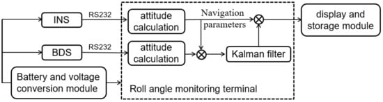 (2) The INS/BDS integrated system was adopted according to the software. In brief, the data of the roll angle from the INS and BDS were sent to the fusion monitoring terminal, where Kalman filtering and data fusion were accomplished in MATLAB. A monitoring system was designed based on MATLAB GUI and used for the acquisition, display, and storage of real-time experimental data.