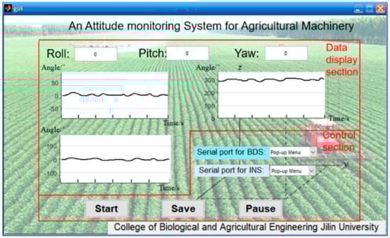 Data of the INS and BDS were fused through the program compiled on MATLAB GUI, and then an integrated monitoring system was designed (Figure 5), which was responsible for the acquisition, display, and storage of test data in real time. The software interface consists of two parts: a data display section and a control section. The control section is responsible for system operation, data storage, and pause, and the data display shows the changes of the roll angle.