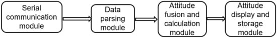 A modular design was finished on MATLAB, including the serial port communication module, data parsing module, attitude fusion and calculation module, and attitude display and storage module. The overall structure of the system is shown in Figure 6.