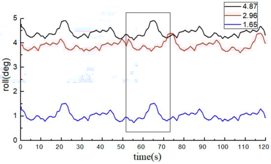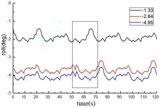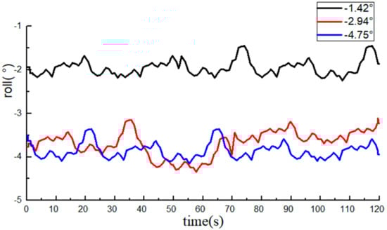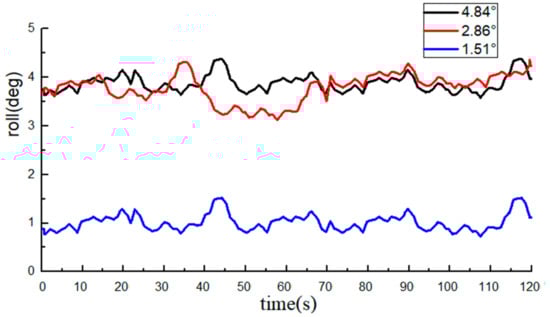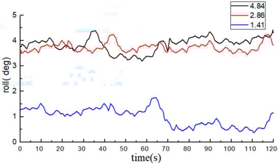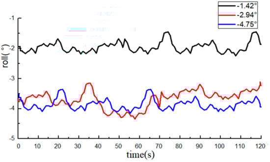 The roll angle data recorded by the INS are shown in Figure 8 and Figure 9. The average value of the 10 measurements by an electronic level bar was used as the reference and compared with the data from the INS. The statistical data are listed in Table 1.