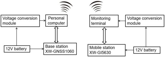BDS consists of a space segment, a ground segment, and a user segment. The ground segment involves main control stations, injection stations, monitoring stations, and other ground stations; the user segment includes the Beidou user terminals and the terminals that are compatible with other satellite navigation systems [28]. The BDS (Beijing Starneto Technology Co. Ltd., Beijing, China) used in this study had two receivers: the mobile station XW-GI 5630 and the base station XW-GNSS 1060 (as shown in Figure 3). The system can output the position, speed, attitude, and other information of the carrier in real time.