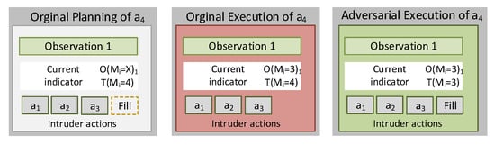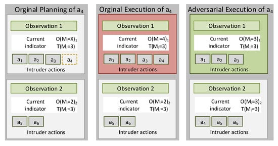 The locality-based mimicry by noise generation approach assumes that the adversary may conduct padding actions (noise). They may distort the metrics generated per monitoring period. Bearing in mind the adversarial model , lower thresholds will be generated. When some certain is not reached within the observation interval, the attacker will conduct padding activities targeted at increasing the values of the attributes considered for its calculation. In analogy with the previous example, let the action “access the file f” that affects the metric =”Average time between same File name accesses”, and the condition , the adversary will continue accessing random files with this purpose if reaching the condition . In Figure 3, an example of this procedure is illustrated. Accordingly, the original planning of the intrusion activities considers the execution of three actions: , , and . The upper threshold of is , but under normal circumstances , which triggers the condition that indicates a clear divergence of Observation 1 regarding . The adversarial may perform padding actions to reach , in this way acquiring through Observation 1 greater resemblance to the legitimate usage model.