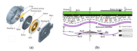 A TRUM is a typical electromechanical coupling system combining piezoelectric actuation with friction drive [24]. As shown in Figure 1a, two-phase piezoelectric ceramics are bonded symmetrically below the ring-shaped stator made of phosphor bronze material. When two-phase AC voltages are applied to the piezoelectric ceramics, the traveling wave impels the stator particles to vibrate with elliptic trajectories. Finally, the movements and accumulated energy are transferred to the rotor through a friction interaction for driving the terminate load. The friction layer of TRUM60A is polytetrafluoroethylene (PTFE), which has excellent time-varying stability [25]. What should be emphasized is that there is a gasket or disc spring between the bearing and the rotor. The component serves as the elastic element for withstanding the deformation caused by pre-pressure during assembly.