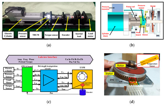Figure 2a displays the mechanical test bench which is composed of an ultrasonic motor (TRUM60A), an incremental encoder (AFS60A, 65536 lines, SICK Corp., Waldkirch, Germany), an electric cylinder (EA0400, Huitong Corp., Nanjing, China), a torque sensor (9349A, Kistler, Sindelfingen, Germany) and a DC motor (55LYX04, YGGT Corp., Beijing, China) which is capable of generating any load profile in the current closed-loop mode. The electric cylinder is first employed to regulate the preload of the TRUM. As shown in Figure 2b, the axial force generated by the cylinder is transmitted from the piston rod to the motor shell. There is a force sensor (VC20A050, Vistle Corp., Guangzhou, China) which detects the real-time pressure. The pressure value can be displayed on a monitor or transmitted through a DA channel. Besides, the piston rod, the pressure sensor, and the pressboard were all limited inside a sleeve, which can assure the guidance accuracy of the axial movement. The design not only does not modify the TRUM’s structure but also assures the accurate and digital control of the pre-pressure. Moreover, an NTC film sensor (FWBM-337G104F, Fu Wen Corp., Shenzhen, China) is selected for satisfying the space restraint and response bandwidth of the temperature characteristics. The sensor measures the heating body through the polyimide whose thickness is only 15 µm, and its response time is only 0.1 s. As shown in Figure 2d, the sensor is placed against the stator’s teeth gap and near the interface where the heat is most concentrated. The signal is processed through a Wheatstone bridge which has been embedded into the circuit.