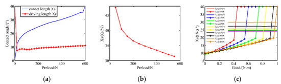 The contact parameters under diverse pre-pressures (simulation): (a) the contact angle and driving angel in no-load condition; (b) the proportion of driving zone in no-load condition; (c) the contact angle and driving angel with external load.