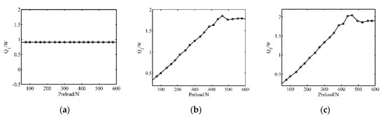 As discussed in Section 2, there are three main types of power dissipation inside the motor, and the temperature rise under different pre-pressures can be deduced. Figure 4 displays the respective time-variant energy loss in function of the preload forces when the amplitude and frequency are 200 V and 43 kHz, respectively. When the preload force is smaller than 460 N, the energy consumption increases as the preload force rises, which results from the gradually- widening contact area. By comparing the results of Figure 4a–c, it can be found that the dielectric loss maintains constant because the value is only related to the exciting voltage amplitude and the dielectric constant, which are both the intrinsic properties of piezoceramics. Furthermore, the stator damping loss and the friction loss follow similar positive-correlation laws until 460 N.