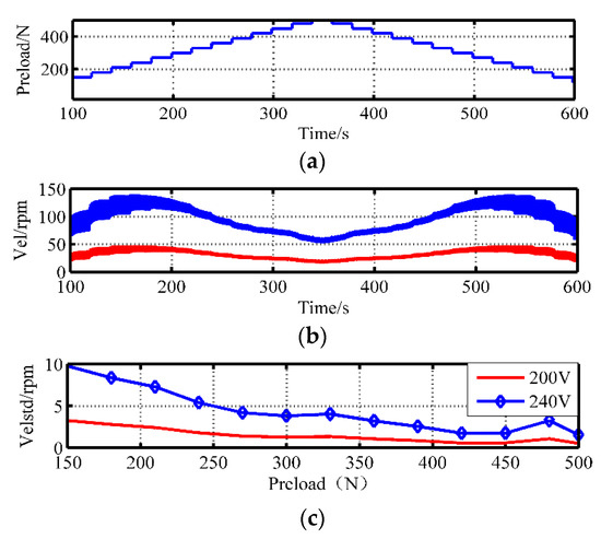 The speed stability under different preload forces: (a) staircase preloads; (b) output speed; (c) speed variance.