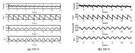 Based on the pressure Fz and the contact length x0 in Equation (1) polynomial fitting is implemented to derive the mapping relationship from the axial pressure to the contact length, as shown in Equation (12). When the pre-pressure is 150 and 200 N, Figure 7 displays the real-time speed, the angular position, the corresponding pressure and the calculated contact length, respectively. We can observe that the velocity fluctuation satisfies a stretch of the 360° cycle, which demonstrates that the fluctuation mostly comes from the un-centered assembly error of the rotor shaft. The wave cycle elongates with declining speed. When the preload is 150 N, the ratio of the maximum fluctuant zone (1.01°) inside the contact zone (24.15°) is 2.53%. If the pre-tightening force is 200 N, the proportion becomes 3.11% as the fluctuation range and the contact angle are respectively 0.9° and 28.94°. In conclusion, the speed fluctuation comes from both the pressure change and the axial assembly error. The change of contact parameters is also accompanied by a pressure change: