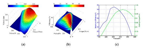 With the aid of the electric cylinder and current sensors, a three-dimensional representation of the speed and the efficiency in function of the torque is shown in Figure 8 within the preload ranging from 150 to 400 N. The curves are obtained when the amplitude is 200 V and the frequency is 42 kHz. The dark blue areas are the stalling-torque areas, while the dark red ones are the maximum value zones of the respective curves. There exists a limit of the pre-stressing forces from which the motor performances fall. Figure 8b indicates the peak efficiency moves towards the larger-torque direction with the change of the preload forces. Deriving from the pictures, the blocking torque and maximum efficiency in function of the pre-pressures are displayed in Figure 8c. The blocking torque achieves the peak value in the moderate pre-pressure (260 N), so does the mechanical efficiency. The pre-pressure at the maximum efficiency point is 320 N. This is because the motor is close to the rotor-locked state when the pre-pressure is substantial, therefore the energy utilization is lower.