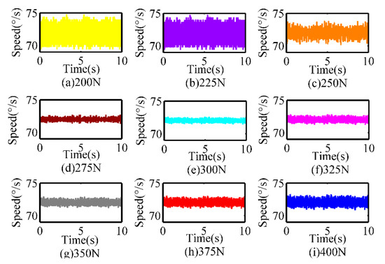 The validity of the optimization criterion is proved by the speed control performance, which not only stems from speed fluctuations but also reflects the effect of temperature rise. The speed closed-loop control with the target 72°/s is implemented under different preloads from 200 to 400 N. Considering the control target is located in the low-speed section, we select the voltage amplitude as the control parameter, the PID control method is adopted for every control process. Figure 10 displays the respective controlling results. It can be seen that residual control error decreases with the increasing preload forces when the preload force is less than 300 N and the error begins to rise once the pre-pressure exceeds 300 N. These results verify the effectiveness of pre-pressure optimization from one aspect, while other aspects will be further investigated.
