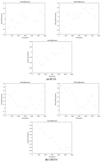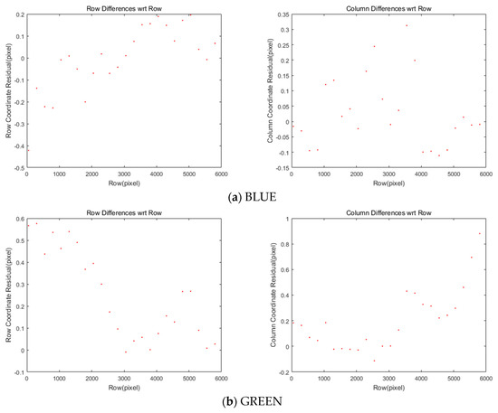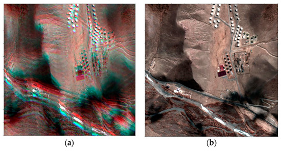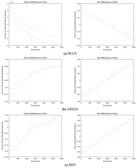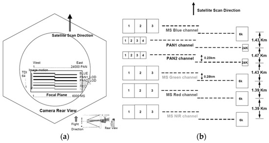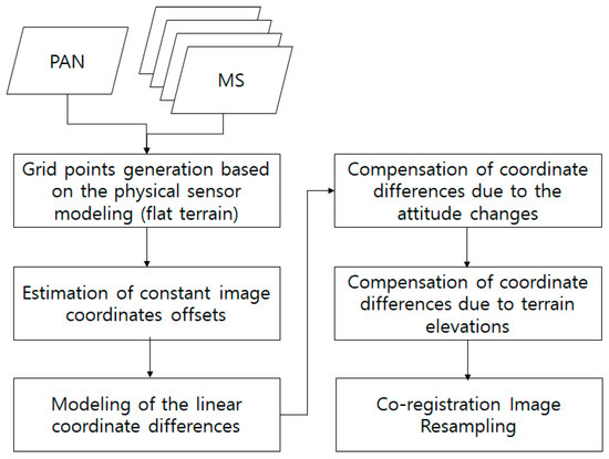11]. However, the performance is highly dependent on terrain features, showing a limited capability over a monotonous terrain (e.g., highly forested area). The sensor modeling approach tends to show higher accuracy, though the rigorous physical modeling process is more complicated and requires the calibration of both the camera and ephemeris models. Currently, the Korea Aerospace Research Institute (KARI) uses image-matching approaches for pan-sharpening image fusion to show mismatch lower than half a pixel in Root Mean Square Error (RMSE) [