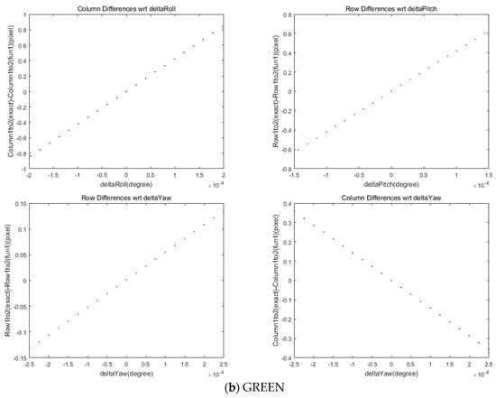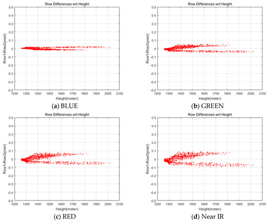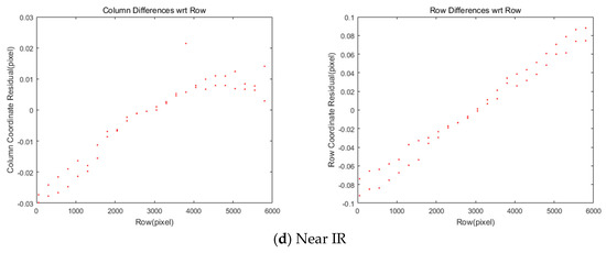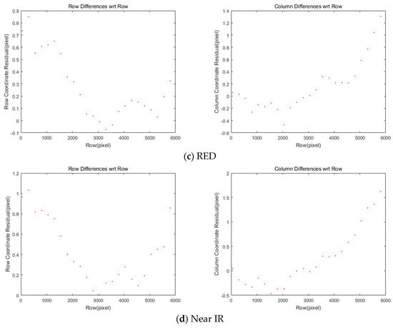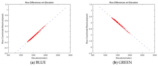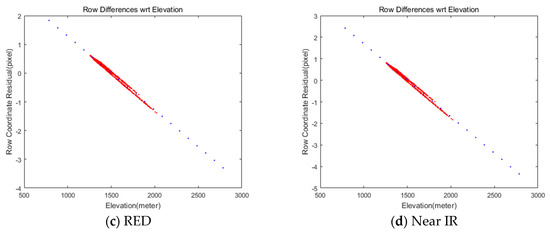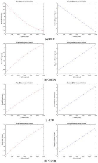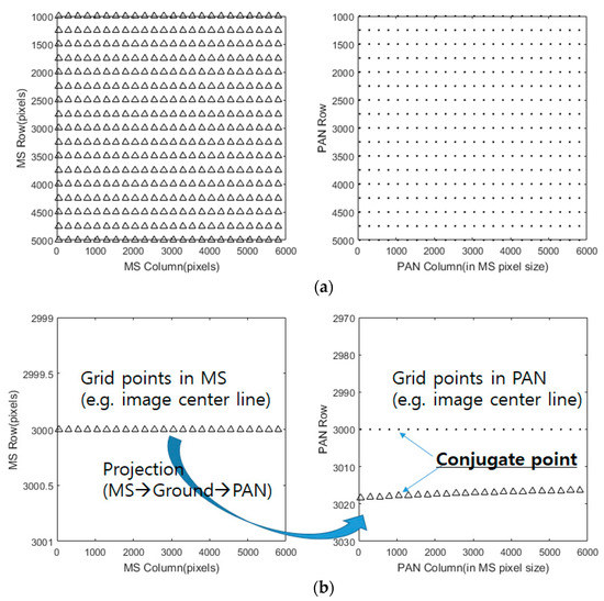 We implemented a grid of conjugate points to analyze the mismatch patterns between MS and PAN. A grid of points on MS were generated and projected into PAN for conjugate points. The coordinate differences between the MS and PAN points come from the differences in the sensor alignment, ephemeris effects, and terrain elevation. These effects can be modeled sequentially. First, the differences of conjugate point coordinates are modelled for constant image offsets and linear coordinates differences. The model can compensate for the coordinate differences, which are mainly from the CCD line offsets between MS and PAN. Second, the coordinate differences from satellite attitude changes are modelled because the attitude changes over time of PAN and MS data acquisition can lead to different PAN and MS image coordinates. Third, the impact of terrain elevation variation on the row coordinates’ differences is modelled to estimate the row coordinates differences through ground-projection-based sensor modeling between PAN and MS image. Finally, the PAN and MS images are resampled for pan-sharpening, taking account of all the aforementioned effects.
