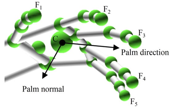 where, is the vertical distance from point to palm plane, is the palm normal (Figure 2), is the dot product, is the multiplication sign.