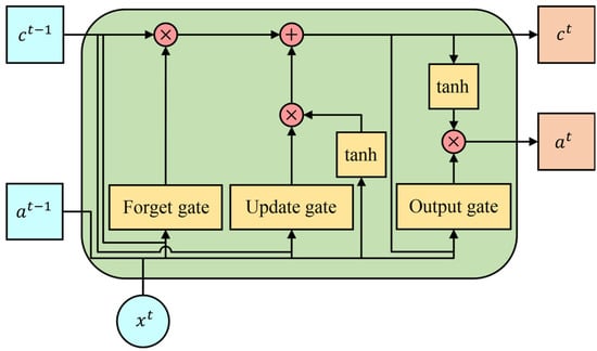 The Long Short-Term Memory unit, as shown in Figure 3, is seen as the memory block and consists of three multiplicative gates which are input gate (update gate), output gate, and forget gate in the network. Additionally, the memory block also includes memory cells that are self-connected and save the temporal information of the network. The input gate is responsible for processing the input of the information. The output gate generates the flow of the output of cell activations to the rest of the units. The forget gate adaptively forgets some information in the memory cell. At time t, the formulas in the unit are defined as follow: