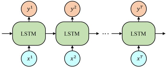 The common Recurrent Neural Network provides an extremely useful method to handle time-based sequences which shows correlations between closely linked data elements in the sequence. Figure 4 shows a basic Recurrent Neural Network architecture with three units. Meanwhile, the previous Long Short-Term Memory unit provides its memory cell and output for the current unit as time goes on. In this figure, the input vector x which contains T frames is input into the network frame by frame. Compared with some other time-based models like Multilayer perceptron and time delay neural networks [], this structure utilizes most of the available input information, from the start frame to current frame, to output vector y without the limitation of using a fixed-format input.