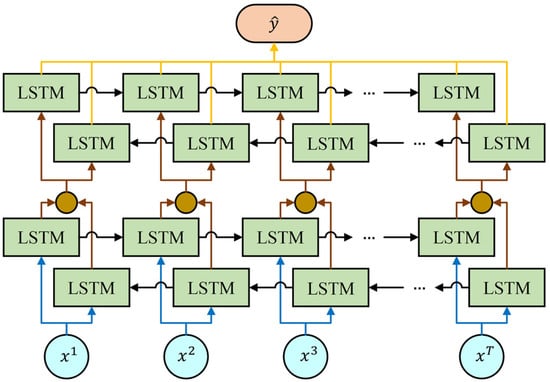 However, in the one-way Recurrent Neural Network, the current unit can only output the outcome based on the information of previous units. Especially, in some problems, the output of the current unit is not only related to previous units, but also related to the future units. In this case, it is possible to use two separate recurrent neural networks and then somehow merge outputs. In the single layer Bidirectional Recurrent Neural Network, one Recurrent Neural Network goes in a forward direction. On the contrary, another one goes in backward direction. At each time point, the input is provided to two independent Long Short-Term Memory units in opposite directions and they combine their outcomes based on the hidden state. In our work, we adopt this structure to build a two-layer BRNN and combine outcomes of the final Long Short-Term Memory unit of both networks (Figure 5). There are many other merging procedures to combine outcomes and it is generally not clear how to merge network outcomes in an optimal way since different networks trained on the same data can no longer be regarded as independent []. The formulas of the basic BRNN unit at time t are given by the following equations: