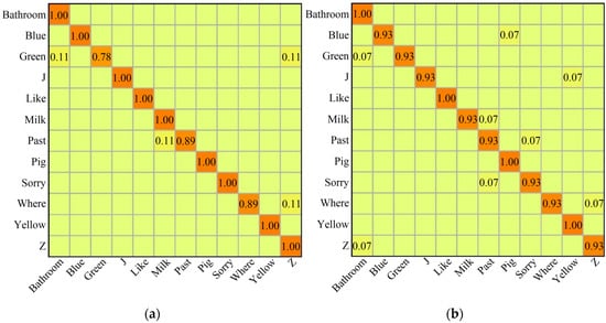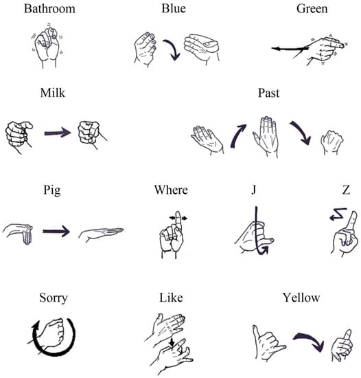 This work is mainly focused on single-hand dynamic gestures. In order to compare with other works, like [,] which has the dataset containing bathroom, blue, finish, green, hungry, milk, past, pig, store, where, j, and z, we replaced finish, hungry, and store with sorry, like, and yellow which are nearly equivalent to them in terms of difficulty.
