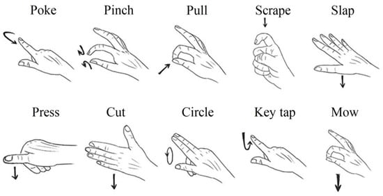 Here, we created two new datasets composed of 12 hand gestures and 10 hand gestures, respectively. They are called ASL Dataset (Figure 6) and Handicraft-Gesture Dataset [] (Figure 7). In particular, the ASL Dataset is picked from the American Sign Language and the other dataset is chosen from the paper [].