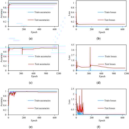 Curves for the accuracies and losses of the training and testing sets. (a) The accuracies of the ASL dataset with 360 samples; (b) The losses of the ASL dataset with 360 samples; (c) The accuracies of the ASL dataset with 480 samples; (d) The losses of the ASL dataset with 480 samples; (e) The accuracies of the Handicraft-Gesture dataset with 300 samples; (f) The losses of Handicraft-Gesture dataset with 300 samples.