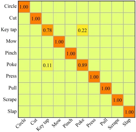 Furthermore, this work also compared the proposed method with the work in [] on Handicraft-Gesture dataset and, as shown in Table 7, our method achieved better performance. In addition, in its confusion matrix, it has low accuracies in the recognition of gesture ‘pinch’ (82.5%) and ‘pull’ (87.5%). However, our work only gets a low accuracy in the recognition of ‘key tap’ (78%) (Figure 11).