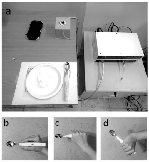 - Zuckerman, O.; Slyper, R.; Keren-Capelovitch, T.; Gal-Oz, A.; Gal, T.; Weiss, P.L. Assisting Caregivers of Children with Cerebral Palsy: Towards a Self-Feeding Assessment Spoon. In Proceedings of the Ninth International Conference on Tangible, Embedded, and Embodied Interaction, Stanford, CA, USA, 15–19 January 2015; ACM: New York, NY, USA, 2015; pp. 557–562. [Google Scholar]