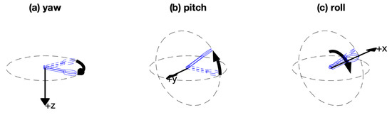 Yaw, Pitch and Roll angles (Tait–Bryan angles). The final orientation consists of three rotations in order: (a) yaw is the rotation about the z (up-down) axis; (b) pitch is the rotation about the rotated horizontal (y) axis; (c) roll is the rotation about the long axis (rotated x axis) of the spoon.