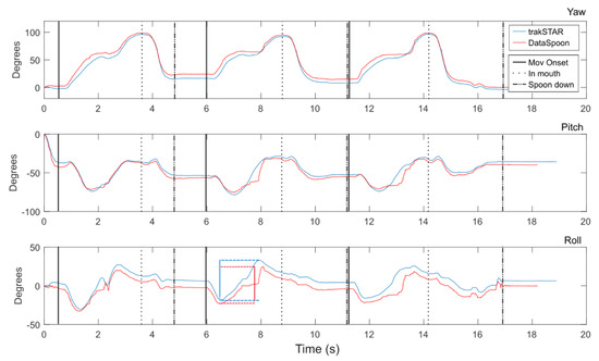 Yaw, Pitch and Roll angles for 3 consecutive eating cycles at natural spoon position and comfortable speed. trakSTAR (blue) and DataSpoon (red) signals were synchronized by a common movement of pitch at onset of recording. Black vertical lines indicate timing of eating cycle events identified for trakSTAR signals. Blue and red vertical lines (bottom panel) demonstrate the calculation of range (in this case - of roll) for one movement part.