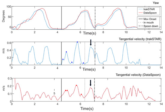Tangential velocity profiles from trakSTAR (middle panel) and DataSpoon (bottom panel). Yaw for both systems is depicted in the top panel for comparison. One movement duration is marked for both devices. The number of peaks in the tangential velocity profile (i.e., zero crossings in the acceleration profile) is marked for the first part of movement (“to mouth”), and the peak velocity is marked for the second part (“from mouth”).