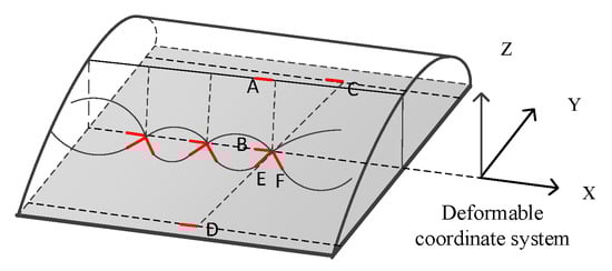 Several fiber Bragg grating sensors are pasted on the wing surface, while assuming that the ith pair of FBG sensor is measured as and , as Figure 3 shows. First, the strain decoupling of each FBG sensor is measured and the linear strain component that is generated by the bending deformation is separated. Then, FBG sensors are divided into n long segments on the wing surface, while each segment could calculate the curvature of the center point by strain. The curvature values at each point are obtained by linear interpolation from the curvature values of the n discrete points. Finally, the deformation angle and the line displacement vector are solved by the geometric relationship.